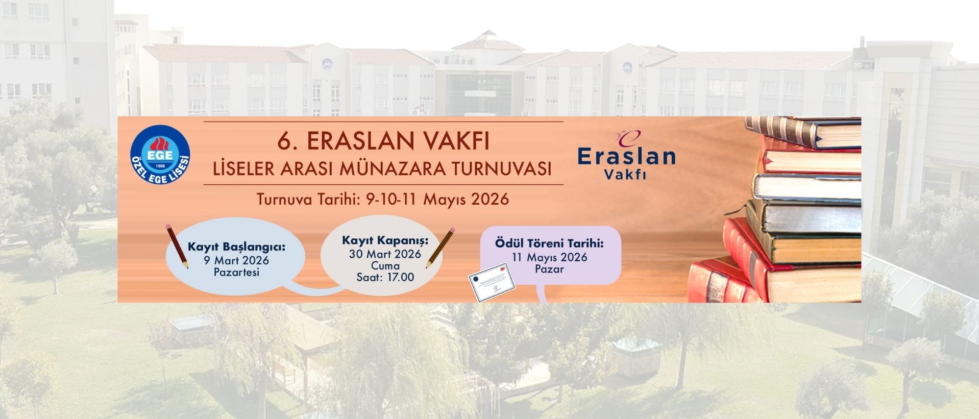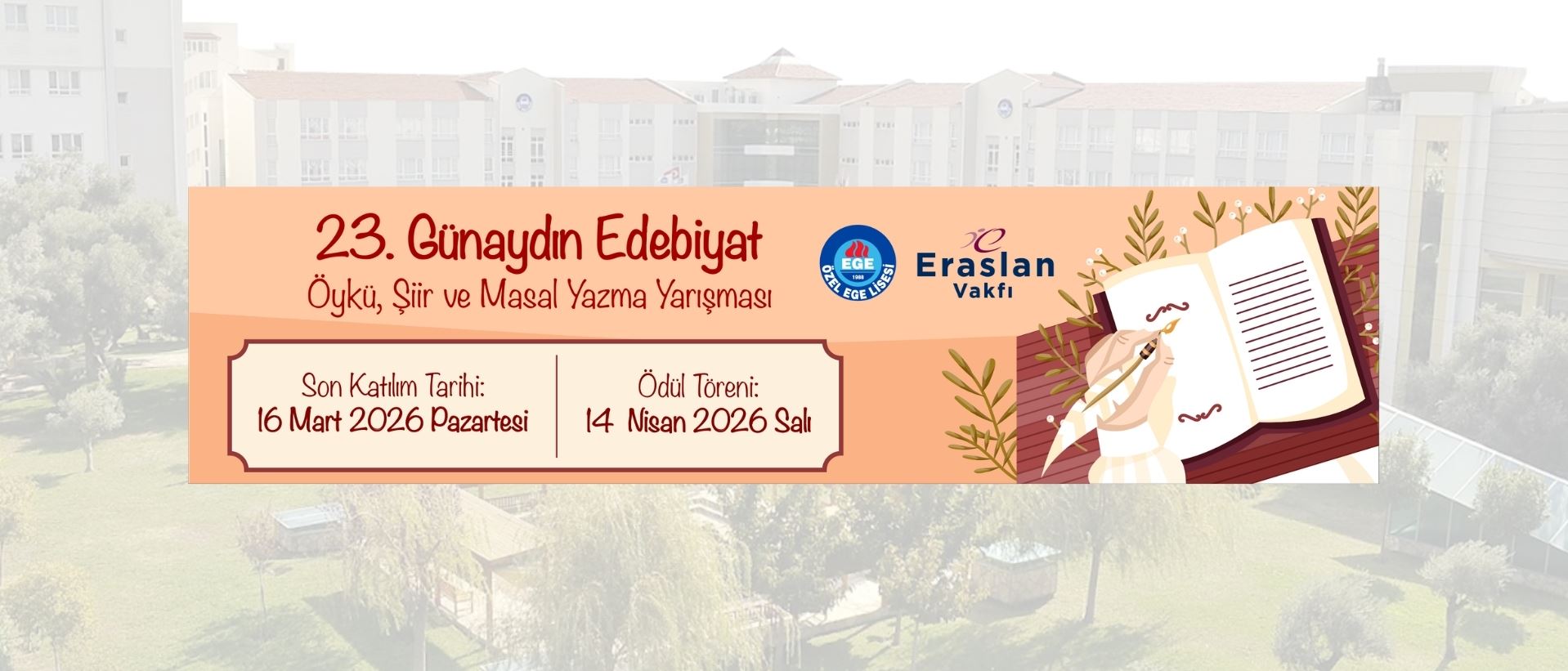Okulumuz; Yüksel Eraslan Kültür Merkezi, Bilim ve Teknoloji Üssü (BİTÜ), ülkenin en büyük okul kütüphanelerinden biri olan Özel Ege Kütüphanesi, Spor Sarayı ve oyun alanları ile K-12 (anaokulu-ilkokul-ortaokul-lise) seviyesinde eğitim veren, 8 bloktan oluşan toplam 25.425 ㎡ alan içine kurulu, zeytin ağaçları ile kaplı yeşil bir kampüste yer almaktadır. Devamı +