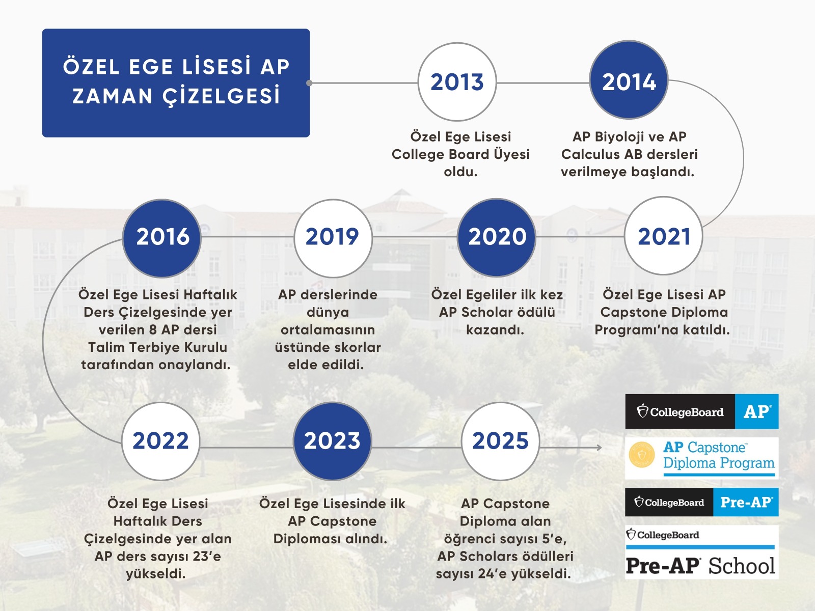 Okulumuz 2021 Şubat ayı itibarıyla AP Capstone™ Diploma Programı’nı akademik çalışmalarına dâhil etmiştir. Böylelikle Özel Ege Lisesi, öğrencilerine çift diploma seçeneği sunmaktadır.