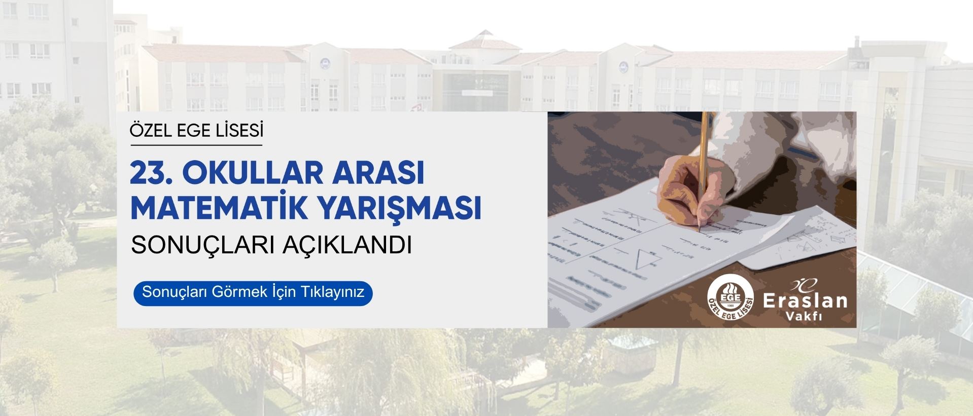 Okulumuz; Yüksel Eraslan Kültür Merkezi, Bilim ve Teknoloji Üssü (BİTÜ), ülkenin en büyük okul kütüphanelerinden biri olan Özel Ege Kütüphanesi, Spor Sarayı ve oyun alanları ile K-12 (anaokulu-ilkokul-ortaokul-lise) seviyesinde eğitim veren, 8 bloktan oluşan toplam 25.425 ㎡ alan içine kurulu, zeytin ağaçları ile kaplı yeşil bir kampüste yer almaktadır. Devamı +