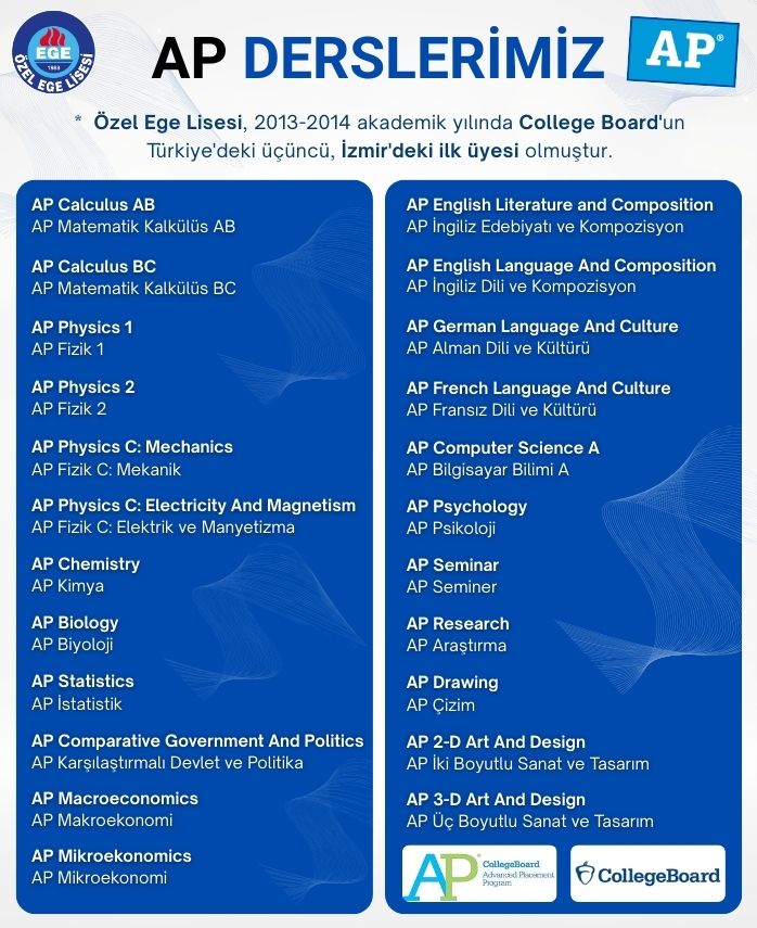 Özel Ege Lisesi, College Board üyesi olduğu 2013-2014 akademik yılından bu yana farklı alanlarda AP dersi veren okullardan biridir. AP sınavlarına katılan öğrencilerimizin tamamına yakını 3 ve üzeri not almıştır.