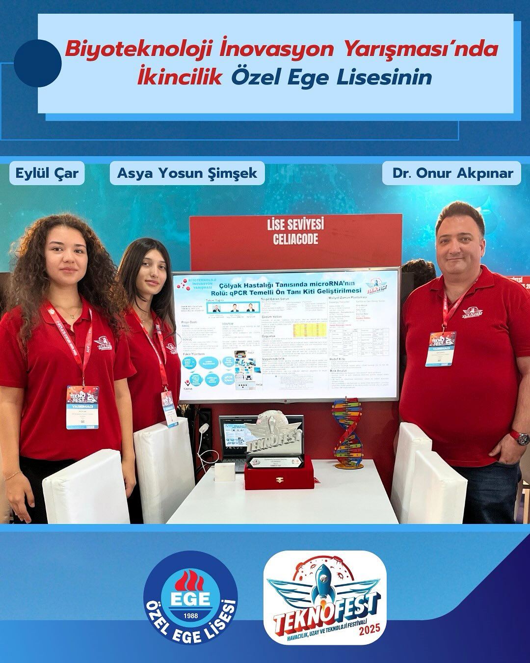 Özel Ege Lisesi 11. sınıf öğrencilerimiz Eylül Çar ve Asya Yosun Şimşek’in Çölyak Hastalığı Tanısında microRNA’nın Rolü: qPCR Temelli Ön Tanı Kiti Geliştirilmesi projesi TEKNOFEST 2025 kapsamında düzenlenen ulusal yarışmada biyoteknoloji inovasyon alanında Türkiye ikinciliği elde ederek bizlere büyük bir gurur yaşattı.